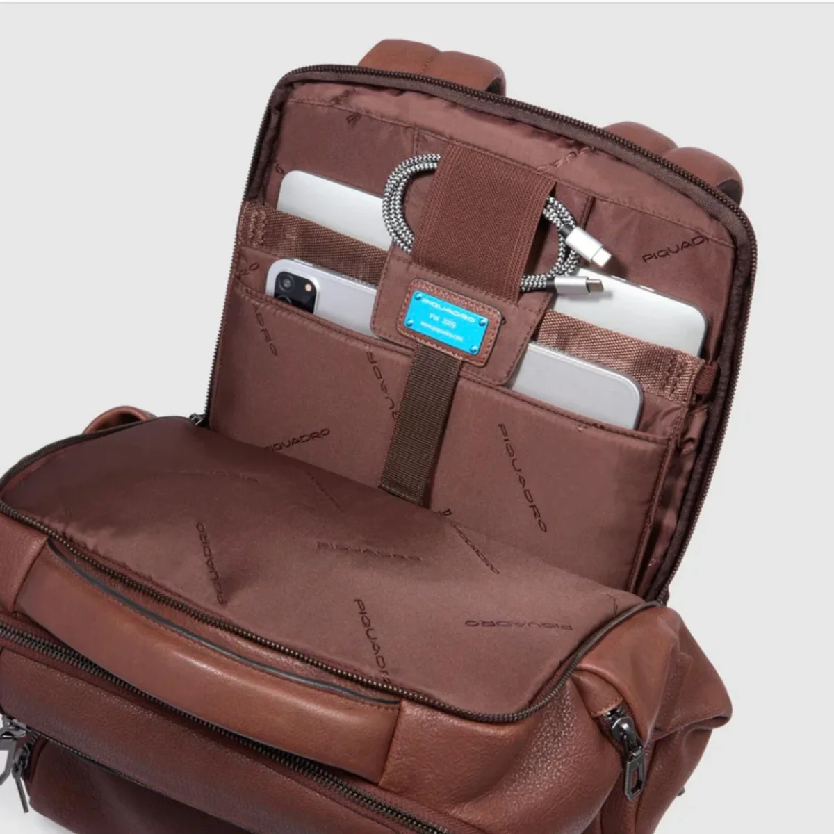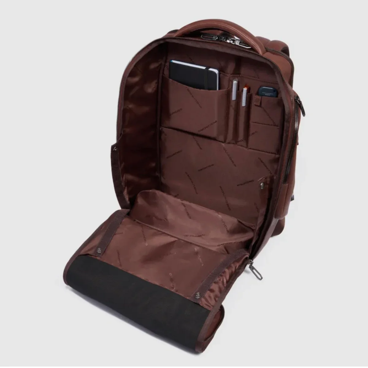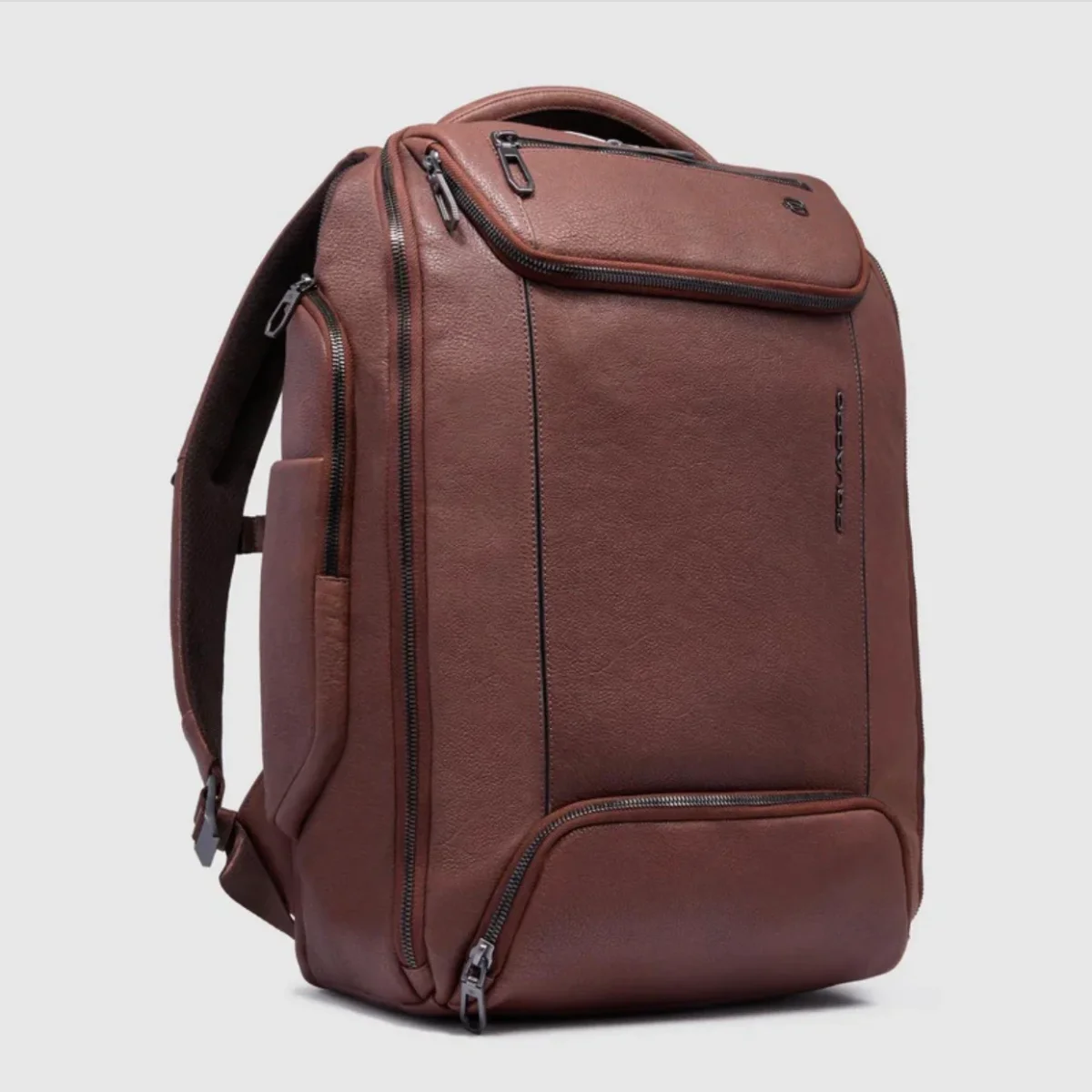 Piquadro zaino in pelle a due scomparti, tasche laterali e tasche frontali.