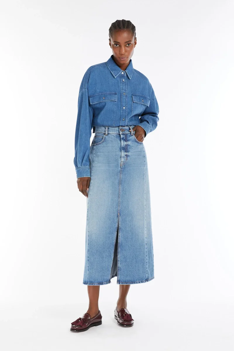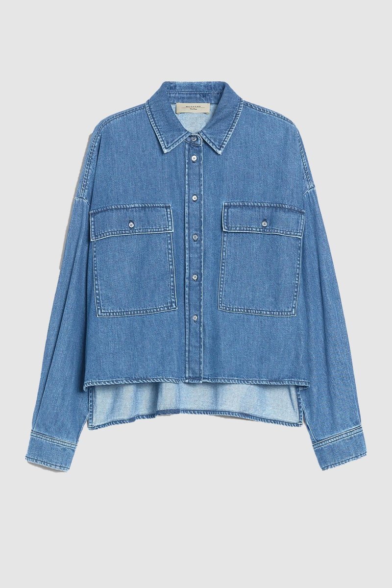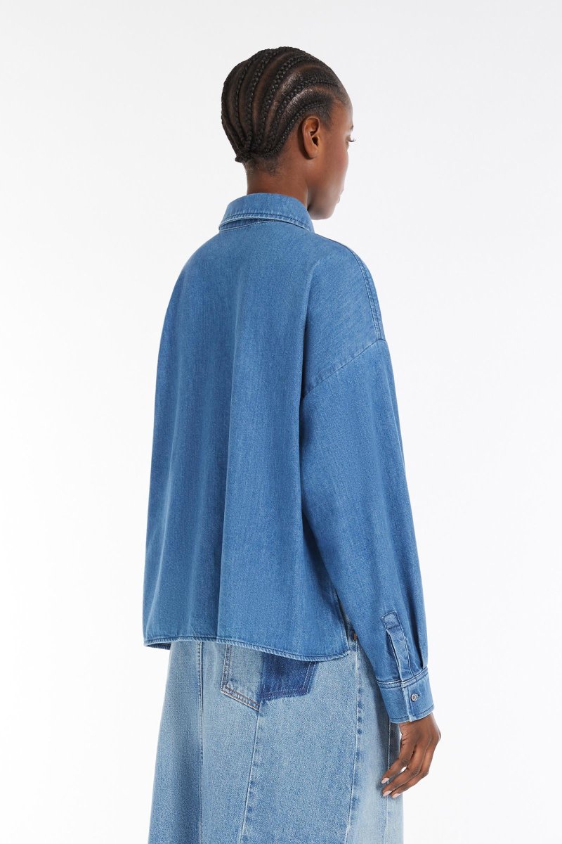 Camicia in denim di cotone dalla mano morbida e fluida. Modello dalla linea boxy caratterizzata da spalle scese, colletto classico e maniche lunghe con polsino e bottone. Grandi tasche con patta e bottone applicate sul petto. Rifinita con spacchi laterali e fondo asimmetrico, leggermente più lunga sul retro. Chiusura con bottoni. Composizione: 100% cotone.
