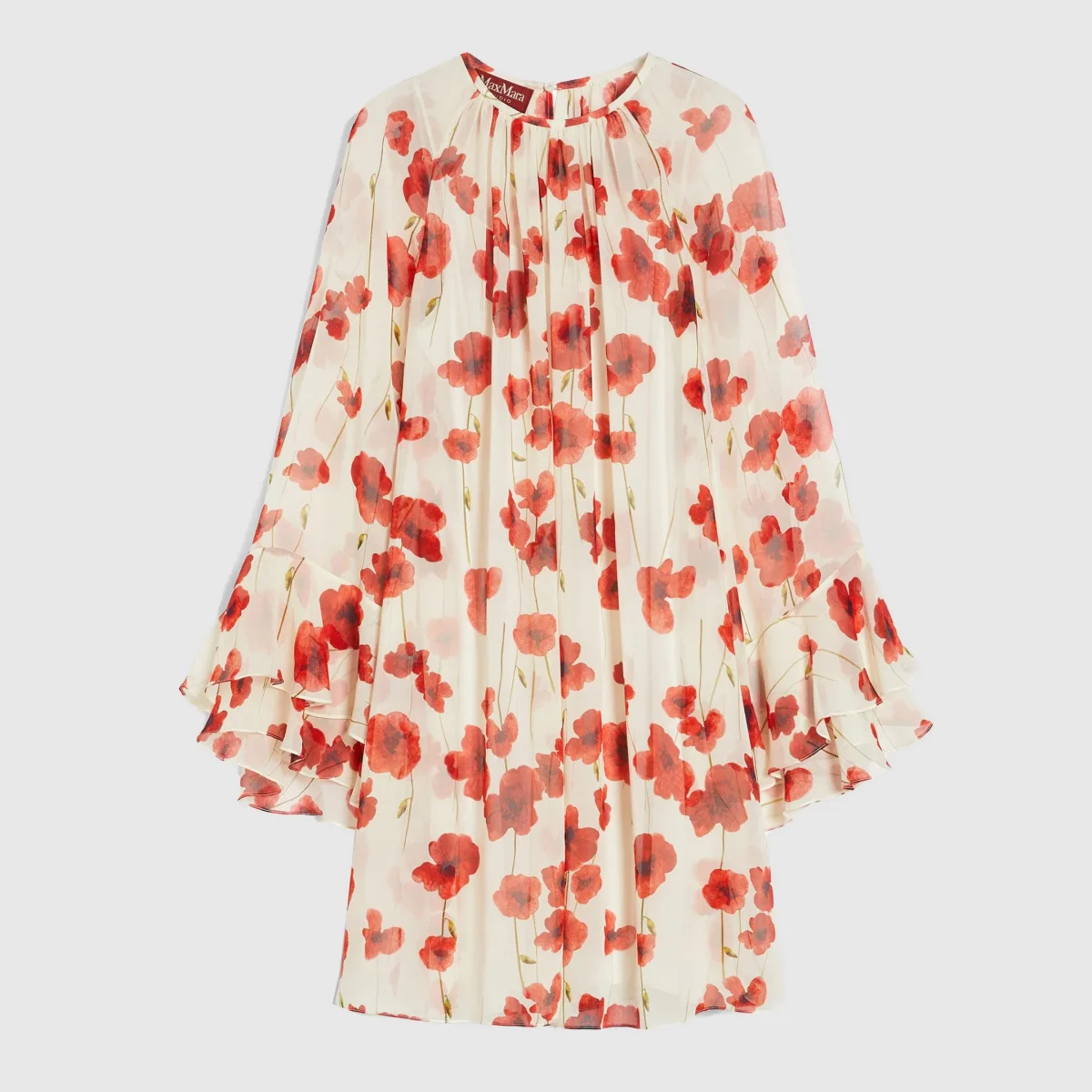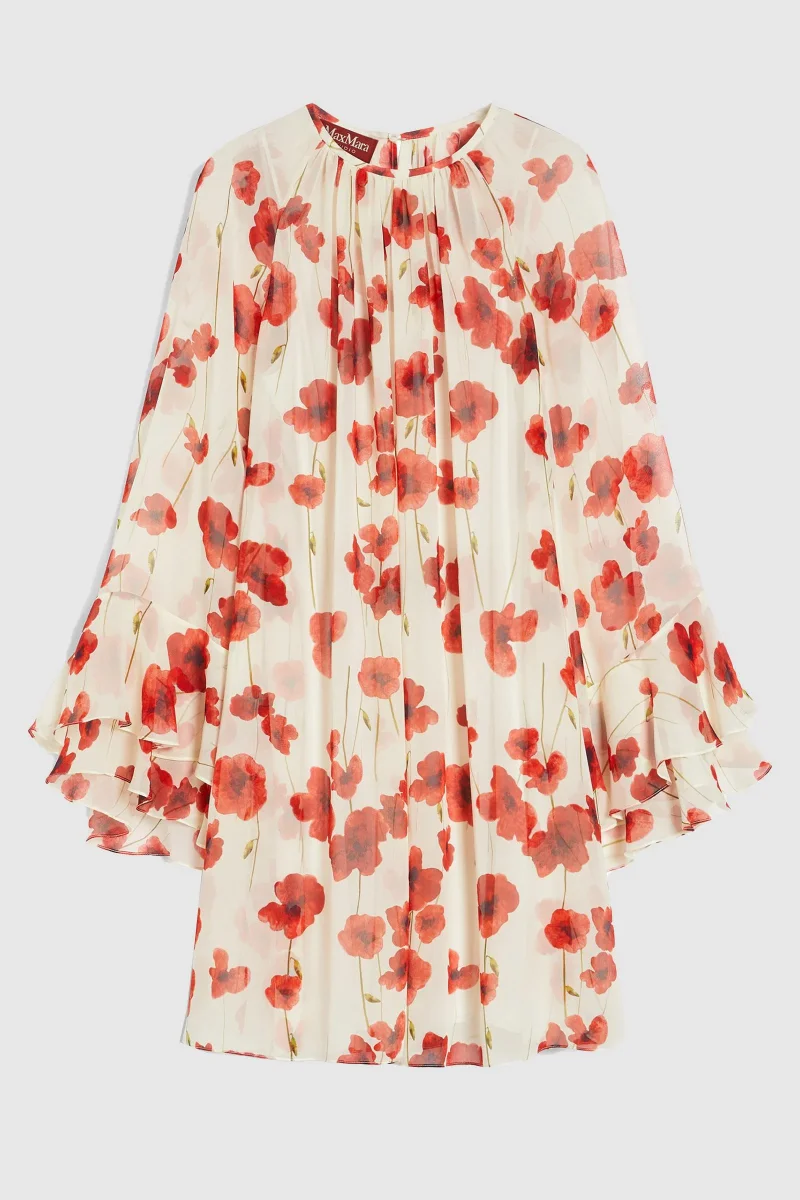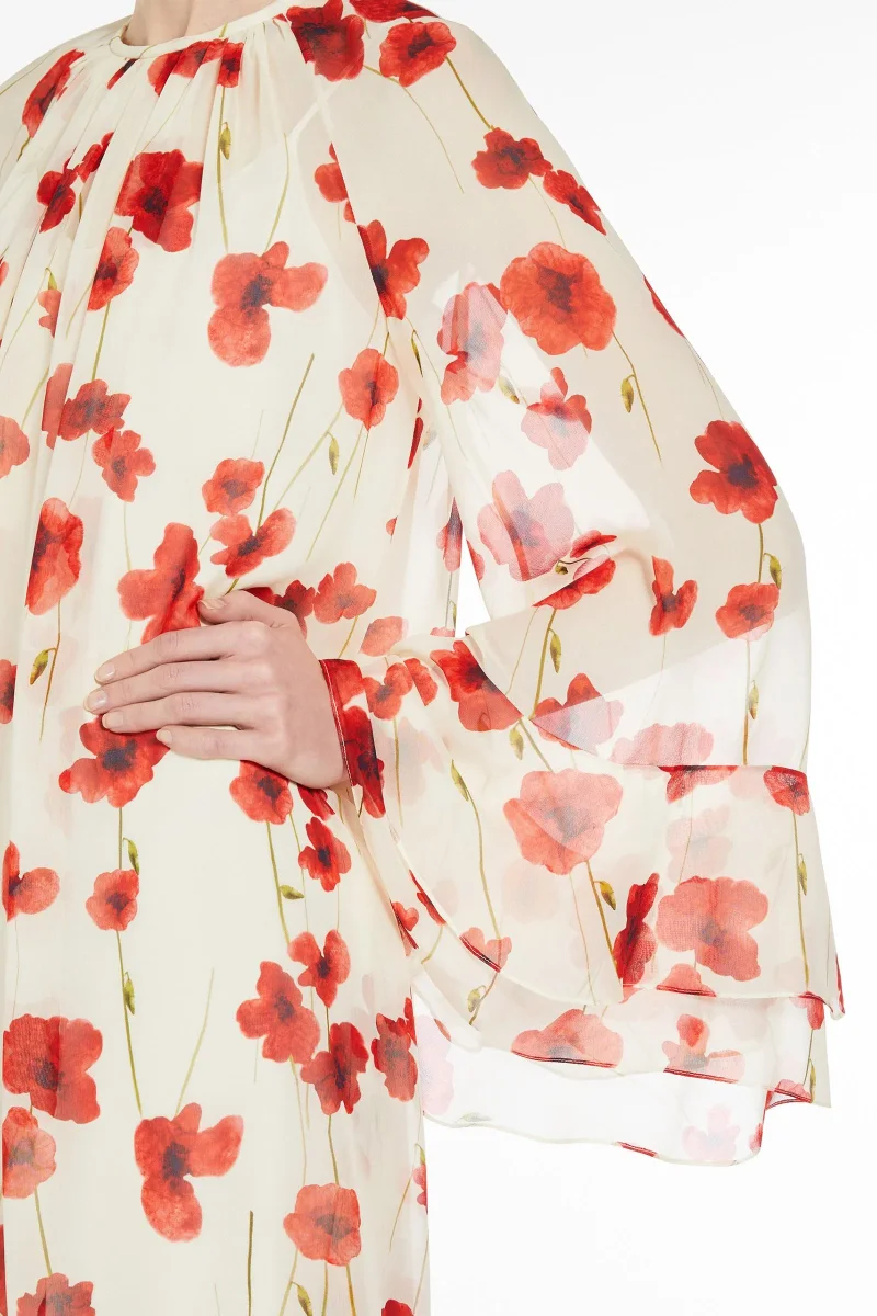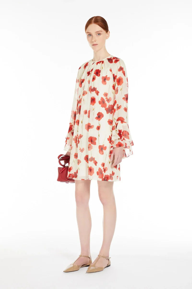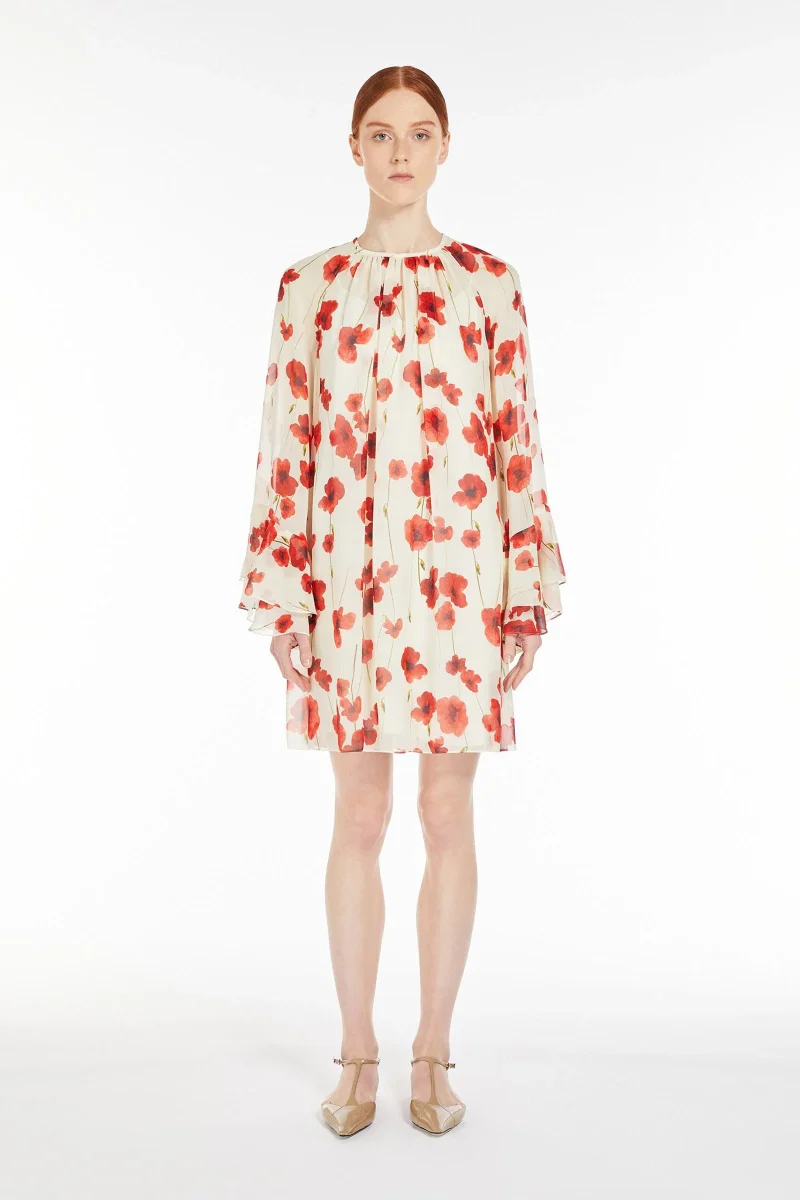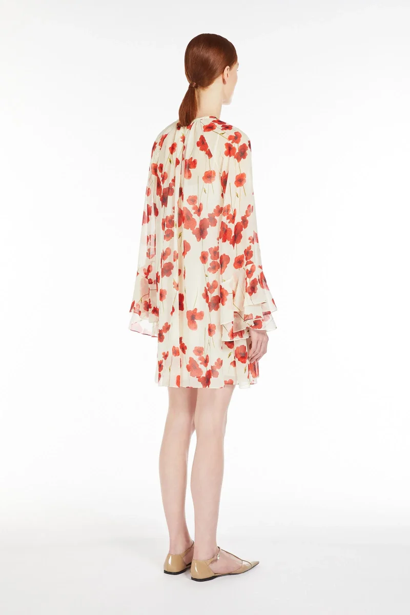 Abito corto dalla linea svasata, realizzato in pregiata e leggera georgette di pura seta stampata. La silhouette femminile è caratterizzata da scollo a giro leggermente arricciato e maniche lunghe raglan con motivo a balza sul fondo. Rifinito con sottoveste abbinata e chiusura a goccia sul retro. Composizione: Abito 100% seta. Sottoveste 85% acetato, 10% seta, 5% poliammide.